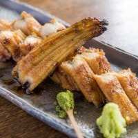 白焼は、わさびと岩塩を白焼きと一緒にガリガリっと言わせて食べるか、昔ながらの塩分きつめのハードな醤油「番場醤油」を一、二滴たらしてお召しあがり頂くのがおすすめです。よく冷やした純米酒を友とすればその味が一層引き立ちます。